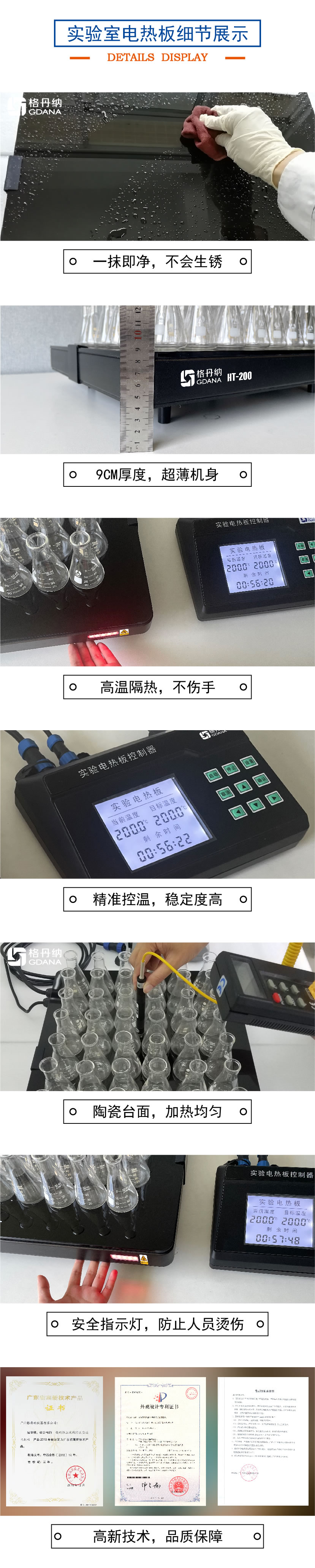 2.加熱板整體都采用進口材料做成它耐磨損,壽命長,表面光滑易清潔,就像玻璃一樣用布一擦就可以很干凈。