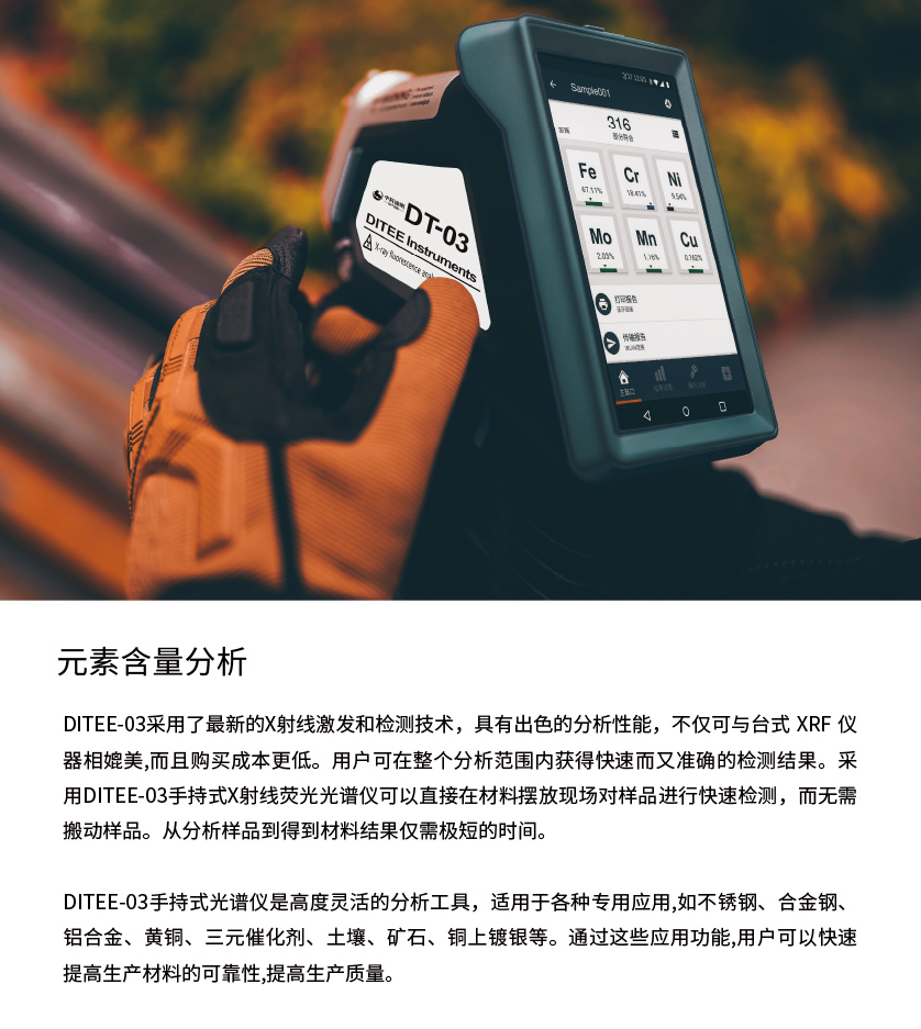 由于DITEE-03手持式光譜儀采用的是X射線熒光光譜技術(shù),所以可以對材料進(jìn)行完全無損地檢測,任何材料在檢測過程中都可以保持原來的形態(tài),無需特殊的前處理。通常DITEE-03手持式光譜儀可以檢測固體、液體、粉末等不同形態(tài)的材料。