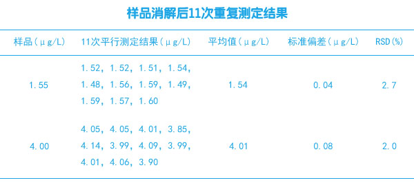 分別對濃度為1.55μg/L的固廢樣品和濃度為4.00μg/L的標準樣品消解后進行重復測定11次,測定結果見表1。
