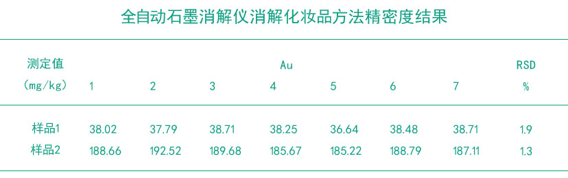 從表中所得出,采用全自動消解儀濕法消解方法測定化妝品中的金含量,多次取樣檢測結果的相對標準偏差1.9%和1.3%,表明此方法精密度較好,適合實驗要求。