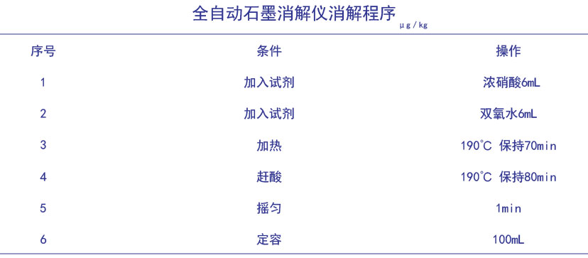 《中國藥典》中有規(guī)定了中藥中鉛、鎘、砷、汞、銅的檢測方法,對于沙星類抗生素中的其它金屬元素殘留未作規(guī)定。本文采用全自動石墨消解儀酸消解方法對樣品進(jìn)行前處理消解,測定左氧氟沙星膠囊中鉛、鉻、砷、鎘、錫、鋁、鐵7大金屬元素含量。消解儀高程度自動化消解,操作簡單、批處理量大,解放人力繁瑣操作,大大提高工作效率。