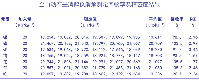 驗證消解方法的回收率與精密度,稱取約0.2g,然后按上面的消解方法進(jìn)行樣品處理,進(jìn)行6次平行測定回收率及方法精密度結(jié)果如下: