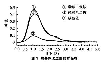 試驗分別吸取5mL 5%硝酸鎂、磷酸二氫銨、磷酸氫二銨、磷酸銨作為基體改進劑對鉻標樣及樣品進行測定,其基改劑的上機濃度為1%(體積分數)。結果(表1)表明,硝酸鎂作為基改劑時,標樣響應值較高,標樣與樣品測量值偏高;而選用磷酸二氫銨、磷酸氫二銨、磷酸銨為基改劑時,響應峰峰形好(圖1),測定結果沒有差異,回收率也在范圍內。但選用的磷酸二氫銨、磷酸氫二銨溶液作空白測 定時,空白值偏高。因此,選擇5%磷酸銨作為鉻測定的基體改進劑,這與國標法選用的一致。