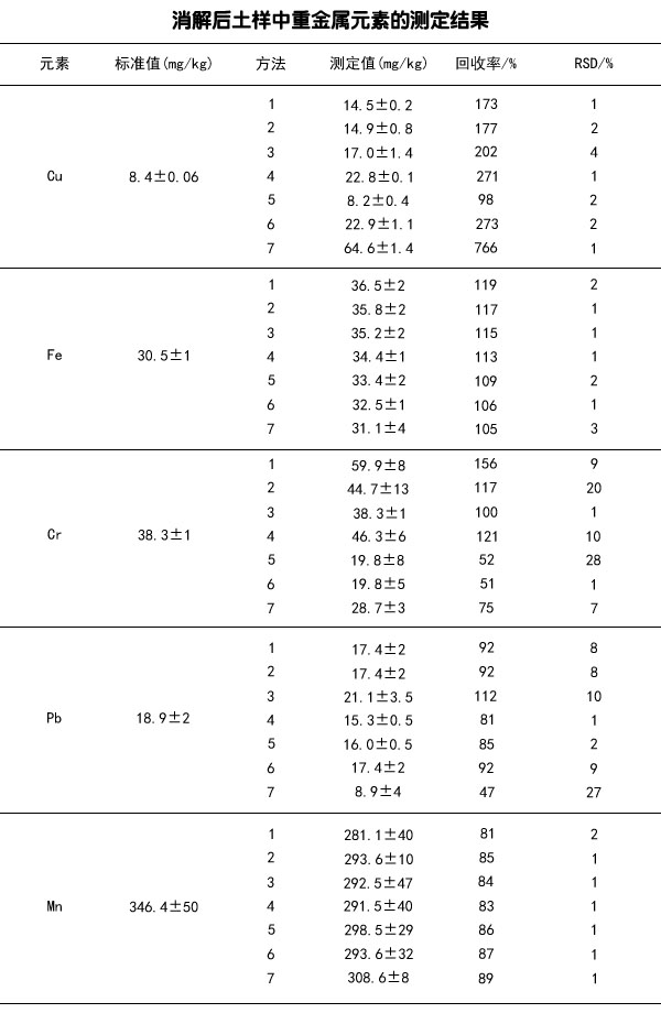 討論:不同類型的土壤中重金屬含量有較大差異,不同消解方法對重金屬含量分析的影響也有差異。文中選用的7種消解方法對標(biāo)準(zhǔn)土樣Cu、Fe、Mn、Pb、Cr含量的測定值顯示,只有Fe、Mn含量的測定值在標(biāo)準(zhǔn)值范圍內(nèi),Cu含量在HCIO4蒸干的條件下測定值不在標(biāo)準(zhǔn)范圍內(nèi),Pb含量在HNO3蒸干、HF蒸干、HClO4蒸干以及HNO3、HClO4同時蒸干、HNO3、HF、HClO4同時蒸干的條件下測定值不在標(biāo)準(zhǔn)范圍內(nèi),Cr含量在只有HClO4蒸干的條件下測定值在標(biāo)準(zhǔn)值范圍內(nèi)。